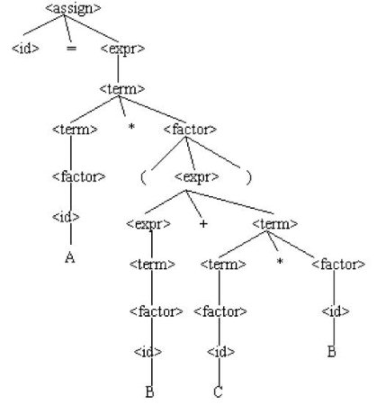 <div id="msgcns!630E02BCA26E400!611" class="bvMsg"><div>A = A * (B + C * B)</div> <div> </div> <div><assign> -> <id> = <expr></div> <div><id> -> A B C</div> <div><expr> -> <expr> + <term> <term></div> <div><term> -> <term> * <factor> <factor></div> <div><factor> -> (<expr>) <id></div> <div> </div> <div>Paring Tree as below :</div> <div><a href="http://pic.pimg.tw/wc0731/9df1385c3b0c87fd61ec5595eab2e15b.jpg?v=1295445002" target="_blank" rel="WLPP;url=http://pic.pimg.tw/wc0731/9df1385c3b0c87fd61ec5595eab2e15b.jpg?v=1295445002"><img alt="" src="http://pic.pimg.tw/wc0731/9df1385c3b0c87fd61ec5595eab2e15b.jpg?v=1295445002" /></a></div></div>